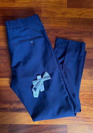Elegante traje de dos piezas de Zara. - Chaqueta de corte clásico con dos botones. - Pantalón a juego. - Color azul marino.