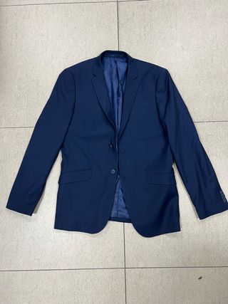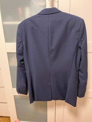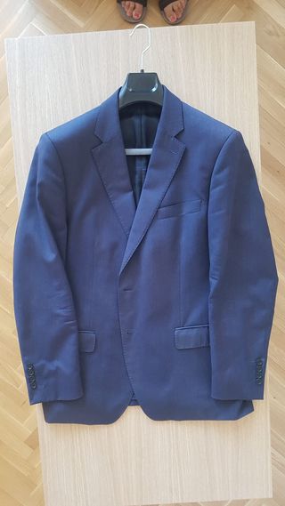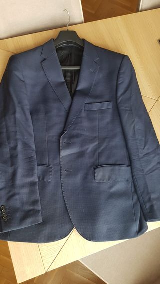 Chico. Un solo uso. Slim fit, pantalón estrecho abajo, tipo pitillo. Talla 38. Azul oscuro. Tejido de calidad. Medidas pantalón: 78 cm desde la entrepierna y 100 cm desde la cintura. Chaqueta: 45 cm hombros y 65 manga y 74 cm largo desde el cuello.