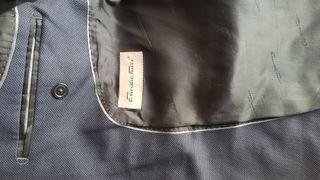 Americana de vestir en color azul marino. Linea comfort (es suave y cómoda, y no tan rígida como otras). Puesto una sola vez. En perfecto estado. - Cierre de 2 botónes - Dos bolsillos frontales. - Puño con 2 botones. - Bolsillo interior. En la foto se ve arrugada porque la tenía guardada. Se puede combinar con el pantalón beige que también tengo en mi perfil (como se puede ver an la foto del conjunto).