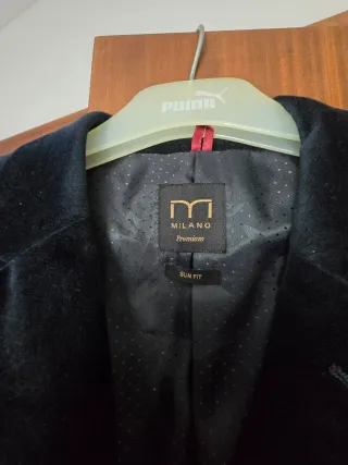 Americana de terciopelo en color azul, con un corte moderno. - Tejido de terciopelo suave. - Diseño de corte entallado (Slim Fit). - Forro interior con estampado de puntos,en la última foto se aprecia una costura algo abierta pero es mínimo, mo llega ha estar descosido.