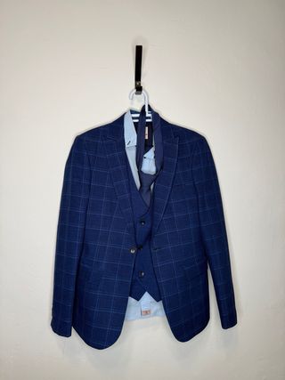 Traje de chaqueta y pantalón de la marca Mango. La chaqueta en la talla 46 y el pantalón en talla 38. Como nuevo, un solo uso. - Diseño a cuadros. - Color azul marino.