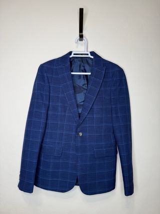Elegante chaqueta de traje azul, ideal para cualquier ocasión. Se encuentra en perfecto estado. - Diseño moderno y combinable. - Dos bolsillos delanteros. - Botones funcionales. Chaqueta muy elegante, y de excelente material y muy práctica, talla 48/50 con tan solo dos puesta para comuniones, estampado moderno y dos bolsillos dentro de esta.