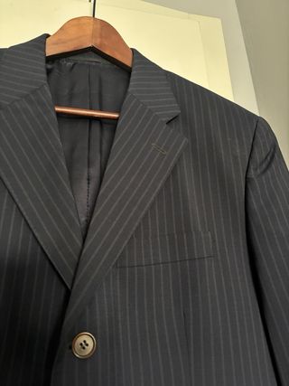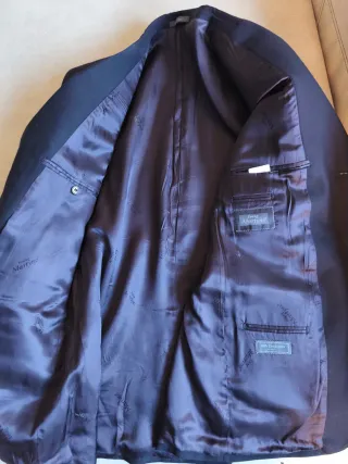 Elegante traje de vestir de dos piezas azul marino más oscuro con detalles en el tejido como se observa en las fotos de la marca Massimo Dutti. La chaqueta es la talla 48 y los pantalones la 38, con un detalle doblado en la parte de abajo. Equivaldría a una talla 36/38 de hombre. El traje no presenta ningún desperfecto, está nuevo. Incluye su funda protectora.