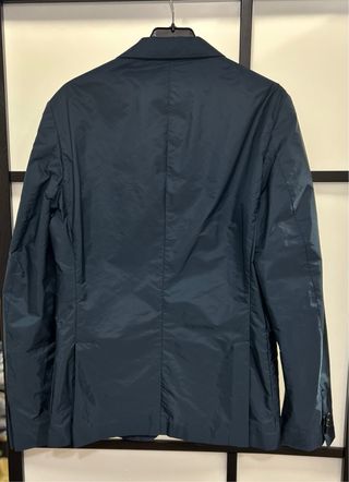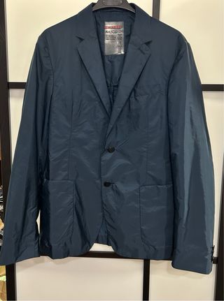 Americana de Prada,de color azul oscuro,de Nylon,muy poco uso,el tallaje es para un hombre delgado.Es preciosa.Planchada queda mejor.