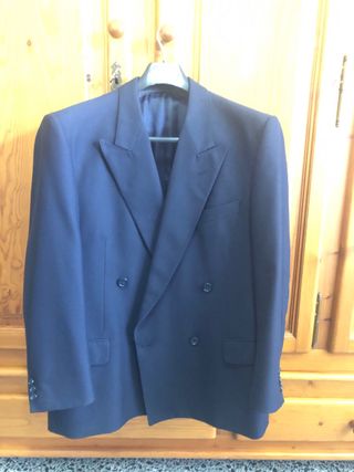 Elegante traje de chaqueta y pantalón para caballero de Pedro del Hierro. - Color azul marino oscuro - material: lana Medidas Chaqueta: - Hombro a hombro: 50 cm - Largo: 82,5 cm desde el cuello - Largo de brazo: 63 cm Pantalones - Cintura de lado a lado: 47 cm - Largo: 107 cm Las medidas están hechas con un flexómetro normal y corriente No tengo cinta métrica