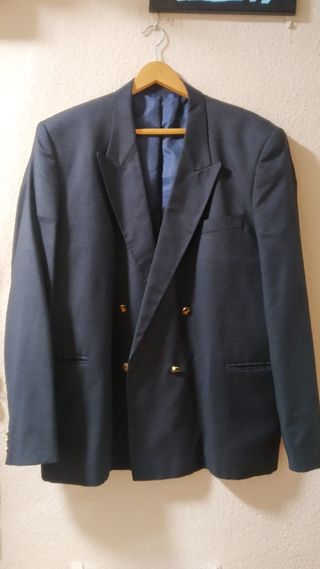 Traje azul marino cruzado 6 botones. Cuello solapa con ojales decorativos. Bolsillo en el pecho y dos frontales. Bolsillos en el interior. Botones decorativos en la manga. Medidas: Hombros 53 cm. Sisa 62 cm Pantalón talla 58.