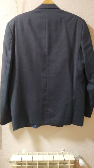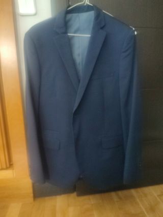 Traje caballero color azul. Usado dos veces y limpio de tintorería. Chaqueta: - largo 74, - ancho 46, -largo manga 62. Pantalón: - largo 109, - ancho 44