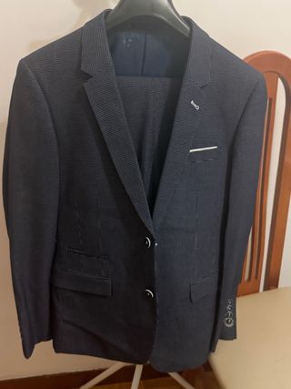 Traje de chaqueta y pantalón de la marca Zara. - Chaqueta de corte moderno. - Pantalón a juego. - Bolsillo de ojal en la solapa de la chaqueta.