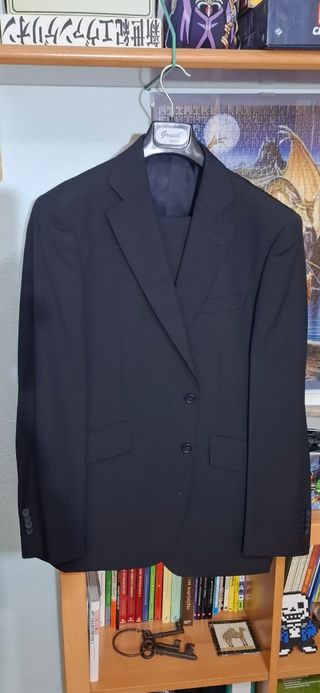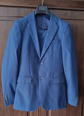 Traje de chaqueta azul talla 44, corte actual, .Nuevo, solo dos puestas. Medidas pantalon: 45 cm cintura y largo 105 cm. (Se le puede sacar tanto de cintura como de largo). Medidas chaqueta: 45 cm de hombro y 65 cm largo de manga