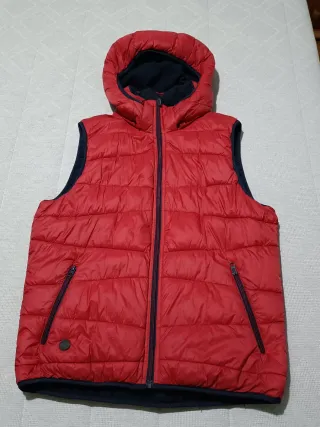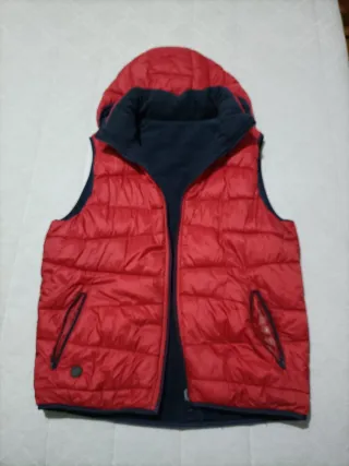 Chaleco acolchado con capucha, forro polar azul. Capucha extraíble. Bolsillos cremallera.