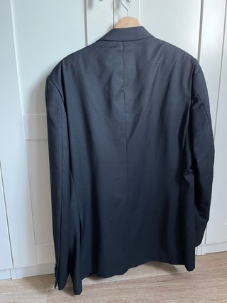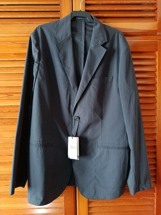 Chaqueta de traje de corte moderno. - Dos botones frontales. - Bolsillos de solapa. - Bolsillo de pecho. - Forro interior. *Nunca se ha usado. Tiene los bolsillos cerrados.
