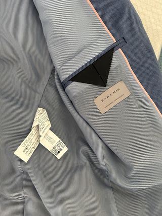 Traje de chaqueta de color azul de la marca Zara. - Chaqueta de corte moderno. - Solapa de muesca. - Cierre de un botón. - Bolsillos de solapa en la parte delantera.