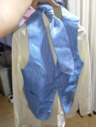 Traje de comunión para niño, talla 11 años. Un conjunto elegante y completoMARCA BAÚL DEL PEQUE. - Chaqueta azul con detalles. - Chaleco a juego. - Pantalón a juego. - Camisa blanca. - Corbata. -Tambien tengo camisa Mahou qué venía con el traje. -Zapatos talla 34.