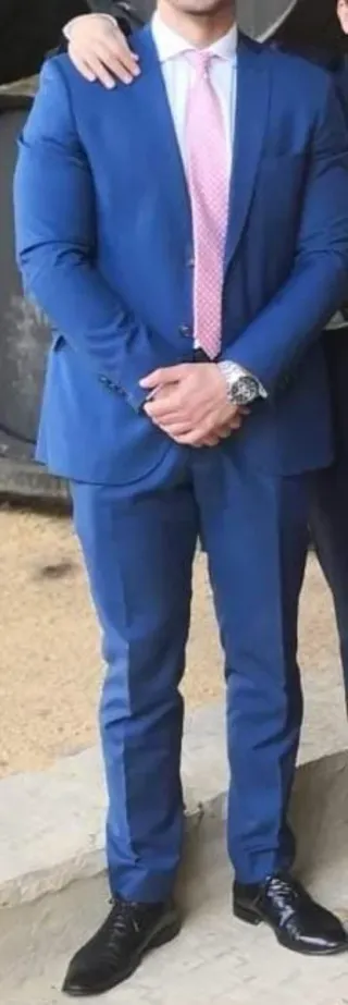 Elegante traje de chaqueta para hombre. El color es un azul más vivo, no tan apagado. - Chaqueta de corte clásico. - Pantalón a juego. - Cierre de botones en la chaqueta.