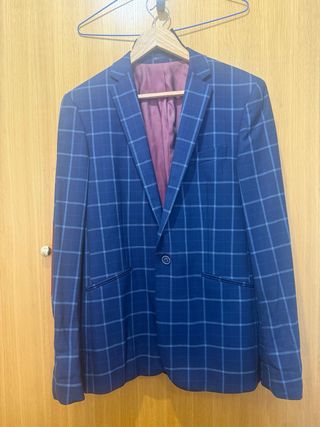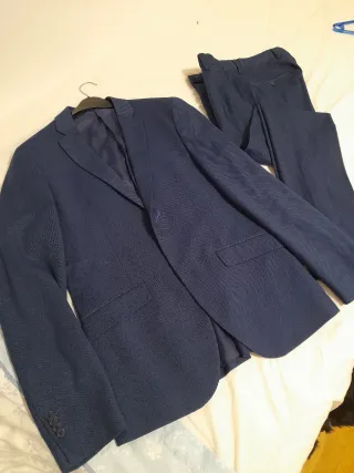 Traje de chaqueta y pantalón para chico, en color azul. Solo se ha usado una vez. - Chaqueta con dos botones. - Pantalón con cierre de cremallera y botón.