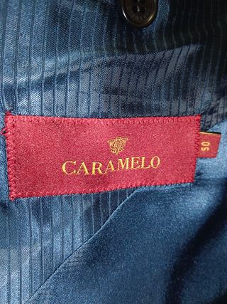 Traje azul marino talla 58, marca CARAMELO.Composicion:70% rayón viscosa y 30% lino. Pantalón con una pinza,,dos bolsillos laterales y uno trasero,cintura 100 cm, largo 114 cm con bajo. Chaqueta 2 bolsillos exteriores y tres interiores, 3 botones, hombros 51 cm, manga 73 cm, contorno 128 cm, largo 83 cm. Chaleco 5 botones,dos bolsillos, hombros 44 cm, largo 64 cm, contorno 126 cm.