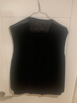 Traje de caballero. Color negro con una fina línea dorada. Incluye chaleco gris claro y corbata. Solo lo usé el día que me casé. Marca Caramelo. Talla 44-52