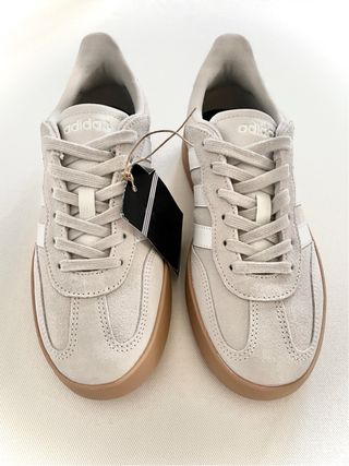 Zapatillas Adidas Barreda. Totalmente a estreno, con etiqueta. En tonos beige y blanco. Un diseño clásico y versátil. - Número: 41. 7 1/2 Americano. - Parte superior de ante y detalles en piel. - Tres rayas laterales en contraste. - Suela de goma de color caramelo.