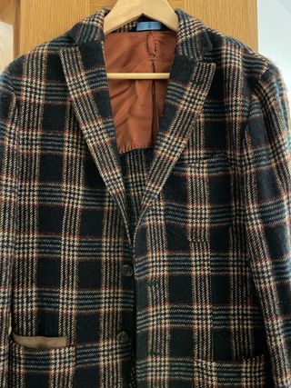 Americana de vestir de El Ganso con estampado cuadro de Gales y las típicas coderas de la marca. Entalla de maravilla y estiliza muchísimo. Material de primera y muy cuidada. - Diseño de cuadros en tonos beige y azul. - Forro interior azul. - Detalle de coderas. - Botones en puños y delanteros. Talla 50. La vendo con la percha oficial de El Ganso y con la bolsa de transporte de la marca.