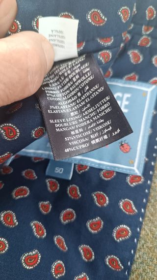 Chaqueta de vestir para caballero con un diseño clásico y elegante. Muy bonita, perfecta para ocasiones formales o para añadir un toque sofisticado a tu atuendo. Algodón 100% - Forro interior a cuadros Vichy azul marino y blanco. - Bolsillo en el pecho. - Dos bolsillos interiores - Detalles de contrastes de colores en coderas azul marino y en remates y costuras en rojo Ideal para días festivos y celebraciones Largo desde hombro 78 cm aprox Ancho espalda medido bajo axila 60 cm aprox Largo manga 64 cm aprox