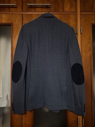 Chaqueta gris de Zara, talla XL pero equivale más bien a una L, con coderas en azul marino oscuro
