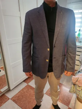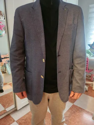 Americana de hombre en color azul con coderas y botones en beige. Talla 42 aproximadamente. Marca: Álvaro Moreno Prácticamente nueva, usada una sola vez. Cierre central mediante dos botones, pinza de entalle en el pecho y manga larga con botones en los puños. Dos bolsillos de parche en cintura y bolsillo de ojal en el pecho. Bolsillos en el interior.