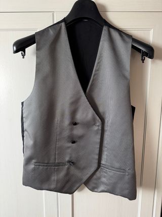 Elegante chaleco de traje con un diseño texturizado plata y negro. Usado en una ocasión. - Patrón de micro-cuadros. - Cierre doble de botones.