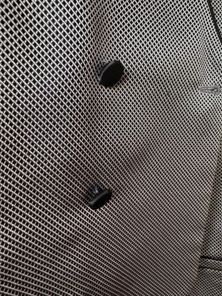 Blazer de Zara, de hombre, pero puede considerarse unisex. Tela en tonos grisáceos con dibujo de cuadros. Triple bolsillo exterior y otros dos interiores (cerrados todos ellos). Cierre abotonado y detalle de cuadruple botón en mangas. Talla 50. Medidas: 55 cm entre axilas, 49 cm entre hombros, 75 cm de largo y 67 cm largo de manga. A estrenar.