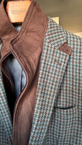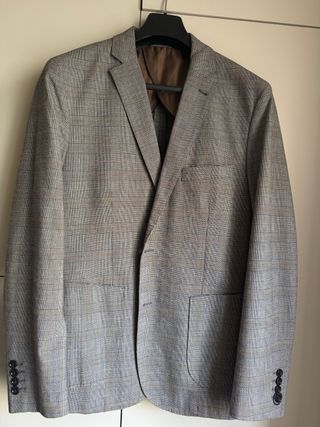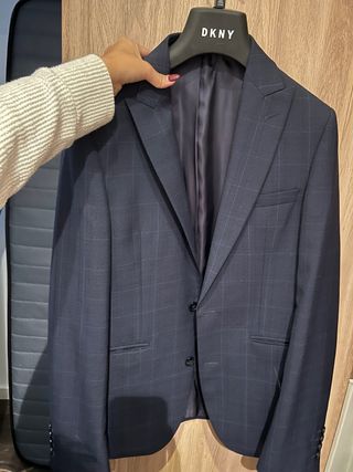 Americana de hombre nueva, talla 38, de la marca Mango (slim fit). Modelo de alta calidad, con un elegante estampado de cuadros en tonos azules. Está completamente nueva, con todas las etiquetas, botones de repuesto y sin estrenar. Cuenta con forro interior en color azul marino y tres bolsillos interiores, dos de ellos con cierre. Los bolsillos exteriores, así como las aperturas traseras, siguen con el cosido original de fábrica, indicando que nunca se ha usado. Corte slim fit, versátil y favorecedor, ideal tanto para look formal como para un estilo más casual. Se entrega con percha y funda de plástico