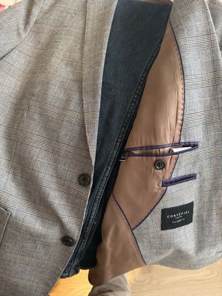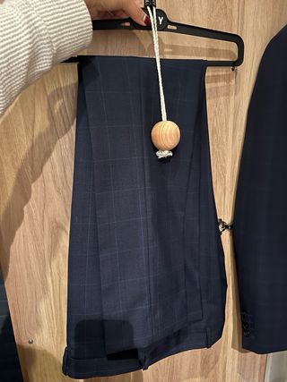 Traje juvenil de la marca Mango con un diseño de cuadros sutil en tono azul marino. Ideal para ocasiones formales o eventos especiales. Por lo demás está perfecto. Ideal para una graduación o similar. - Diseño de cuadros discretos. - Corte moderno y juvenil. - Tejido de tacto suave. Tiene un arreglo de un rasgado en la pierna, hecho por profesional, apenas se nota.