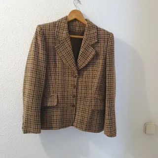 Elegante blazer de lana con un diseño de cuadros clásico. - Tejido de lana de alta calidad. - Patrón de cuadros en tonos marrones y azules. - Detalles de coderas en ante. - Cierre de dos botones.