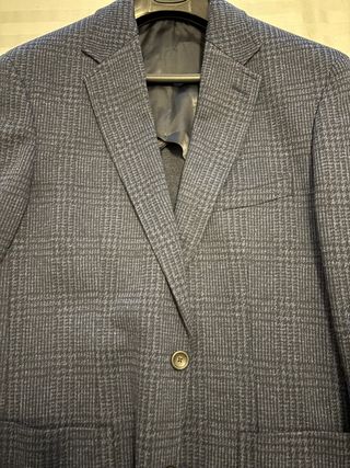 Elegante blazer de Brooks Brothers, una prenda clásica y muy bien construida. Forma parte de un traje en el que se rompió el pantalón. Características: - Corte regular. - Azul marino. - Estampado cuadros muy sutil. - Talla EU 48.