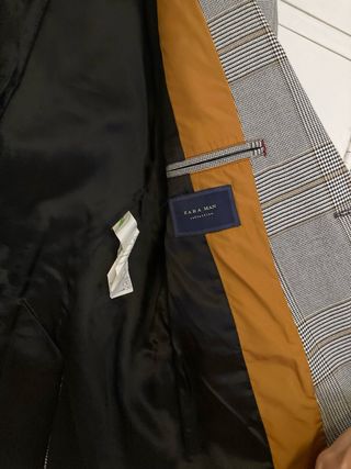 Preciosa Ccaqueta de vestir de la marca Zara, con un diseño de cuadros elegante y moderno. Se encuentra en perfecto estado, como nueva.Usada 3-4 veces. Talla 52, como una M-L - Diseño de cuadros en tonos grises y detalles en marrón y blanco. - Cierre de dos botones. - Dos bolsillos frontales. - Forro interior negro.