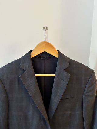 Americana de la marca Hackett con un elegante diseño de cuadros en tonos azules y grises. Colección Mayfair. Tejido Loro Piana de lana y cachemira. Talla 38R (equivale a 48). - Diseño de cuadros. - Cierre de botones