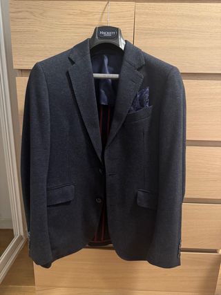Elegante americana de la marca Hackett, perfecto para ocasiones formales o casuales. - Color azul marino con detalles multicolores. - Incluye pañuelo a juego. - Cierre de dos botones. - Bolsillos frontales. -Solapa de muesca Esta americana elaborada en un tejido de algodón jersey con un clásico diseño de cuadros británicos ofrece una opción elegante y cómoda para cualquier ocasión. Con su solapa de muesca tradicional y bolsillos con solapa, esta prenda versátil es perfecta para combinar con unos jeans y alcanzar ese look casual para el fin de semana.
