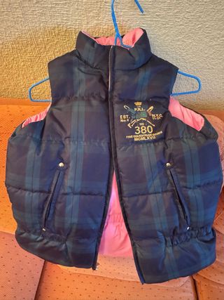 Chaleco acolchado de color azul marino, ideal para el uniforme escolar. Presenta un forro interior con estampado de cuadros. - Cierre de cremallera. - Cuello redondo. 45cm de sisa a sisa