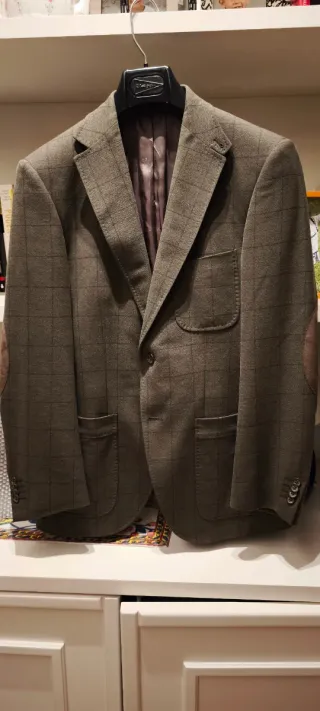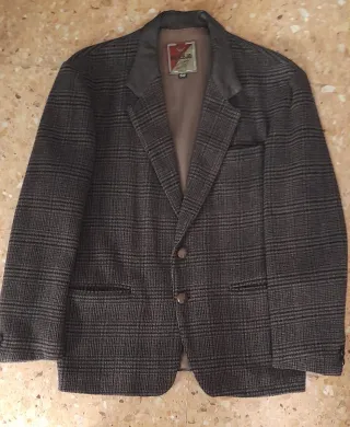 Americana de hombre comprada en Massimo Dutti. Talla 48 La abertura de forro interior se puede quitar, tiebe cremallera. Tiene tres bolsillos interiores. Tela marron oscuro aterciopelada de cuadros. Muy elegante