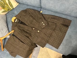 Conjunto de falda y americana de Zara con un estampado de cuadros clásico. - Americana de doble botonadura. - Falda con cinturón a juego. - Diseño de cuadros en tonos marrones y grises.