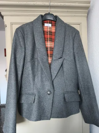Americana de corte clásico con un llamativo forro interior. 41 cm hombros, 45 cintura, 62 largo - Color gris exterior. - Forro interior con estampado de cuadros en tonos naranjas y marrones. - Cierre de un botón. - Bolsillos frontales. - Cuello solapa.