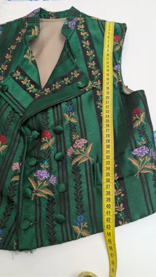 Chaleco de estilo fallero con un diseño vibrante y detallado. - Diseño a rayas verdes con motivos florales multicolores. - Cierre cruzado con botones. - Cuello con solapa.