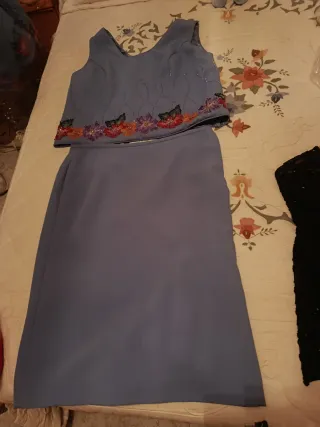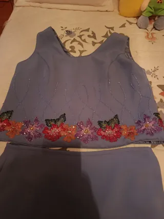 Precioso traje con un diseño floral delicado. La tela tiene un brillo sutil que lo hace destacar. - Diseño con pequeñas flores bordadas. - Acabado satinado en el interior. -Hecho a mano por modista profesional