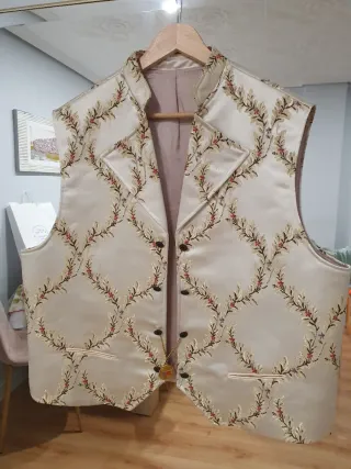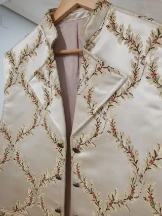 Chaleco fallero beige y flores. Talla 50/52. Usado 2 veces. - Tejido satinado con estampado de ramas y flores. - Detalles bordados en hilo dorado y tonos rojizos. - Cierre abierto con botones oscuros. - Bolsillos frontales.