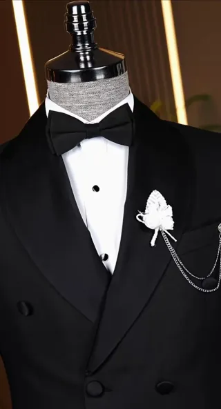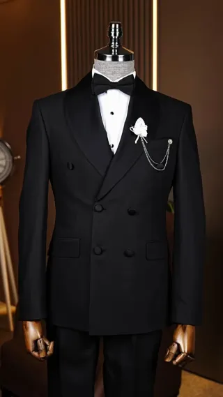 Elegante esmoquin para hombre. - Chaqueta de solapa de pico. - Doble botonadura. - Incluye pajarita. - Adorno de flor y cadena en solapa. Nuevo a estrenar. Tela turca.