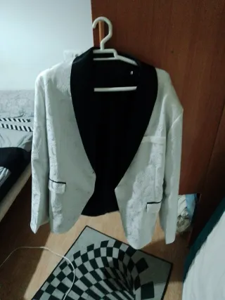 Elegante esmoquin de mayordomo con un diseño llamativo floreado. - Chaqueta con solapa de satén negro. - Tejido exterior blanco con estampado floral. - Dos bolsillos frontales con ribete negro.