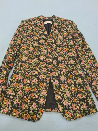 Elegante americana de Zara, edición limitada con estampado floral multicolor. Ideal para un look único y con estilo. - Talla: 42 - Corte: Ajustado - Tejido: Ligero