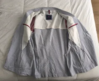 Impresionante chaqueta de algodón 'seersucker' en el clásico color azul claro y blanco. Es de Álvaro Moreno en talla 54 que equivale a una XL, ver medidas en fotos. Excelente confección y detalles, comprada cuando la marca aún realizaba prendas de muy alta calidad. Modelo clásico, bolsillos de parche, dos aberturas traseras, botones con ojales reales en las mangas y algunos detalles en hilo de color en contraste. Excelente estado, usada en contadas ocasiones. Envío con la etiqueta con el precio original de 159,95€ y los botones de repuesto. Ivy League, preppy. (R4599)