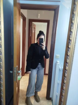 Americana de terciopelo en color verde oscuro, tiene algunas marcas de uso, de ahí su bajo precio, talla S, marca Zara