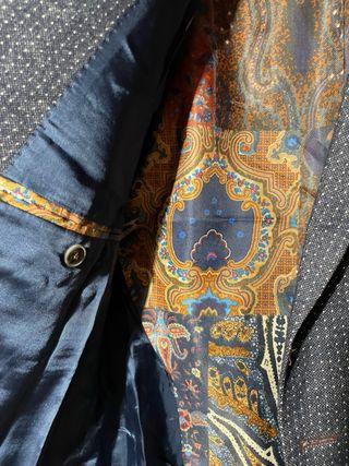Elegante americana de la marca Pierre Cardin. - Diseño con estampado de puntos. - Forro interior con estampado floral. - Bolsillo de pecho con pañuelo a juego.