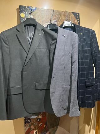 Americana de vestir de la marca Sfera. - Color gris jaspeado y azul marino. - Cierre de dos botones. - Bolsillos frontales. - Cuello solapa. Size 50 los dos