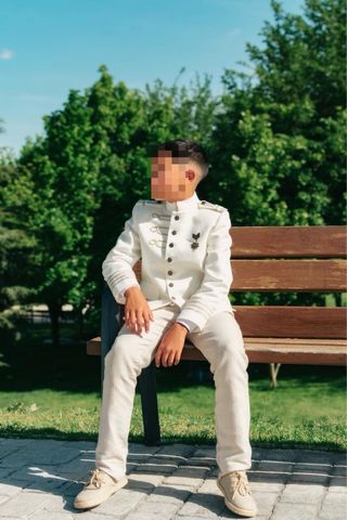 Elegante traje para primera comunión.talla 10 años - Diseño de chaqueta con cuello mao y detalles de botones. - Pantalón a juego. - Incluye un pequeño distintivo en la solapa.